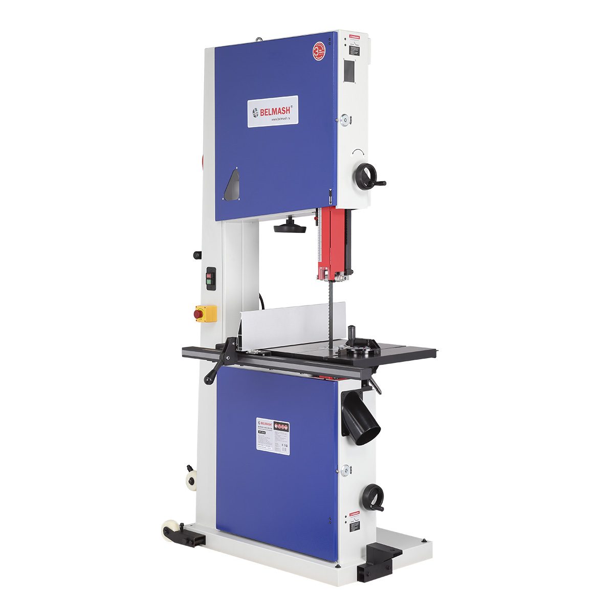 Качество и безопасность реза обеспечивает продуманная система направляющих пильного полотна. Верхний узел с маховиком быстро регулируется по высоте. Боковые опоры и задняя направляющая точно настраиваются шестигранными ключами для минимального зазора и исключения увода полотна. Натяжение контролируется по индикатору в смотровом окне.