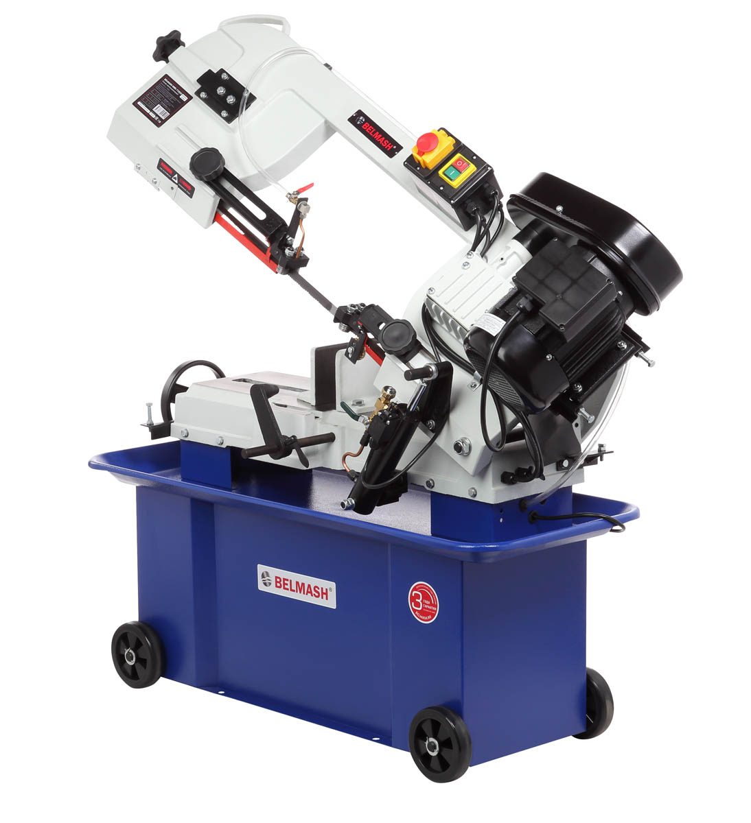 Двигатель асинхронный, с режимом работы S1 и потребляемой мощностью 1100 Вт. Станок работает от сети 230 В. У станка четыре скорости вращения пильного полотна: 22/33/45/65 м/мин. Они переключаются путём перекидывания клинового ремня. Натяжение полотна осуществляется специальной ручкой.