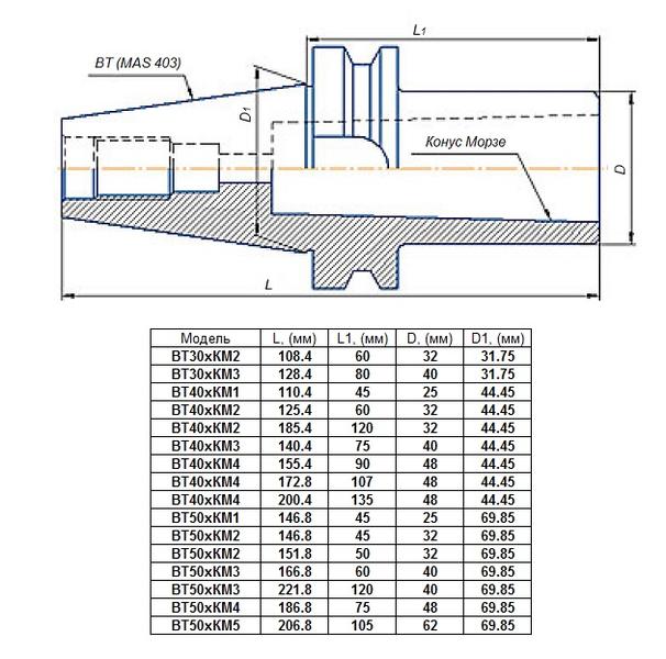 Втулка переходная с хвостовиком 7:24-ВТ40 (MAS403) на КМ1х 45мм для станков с ЧПУ со сквозным отверстием для конц. фрез